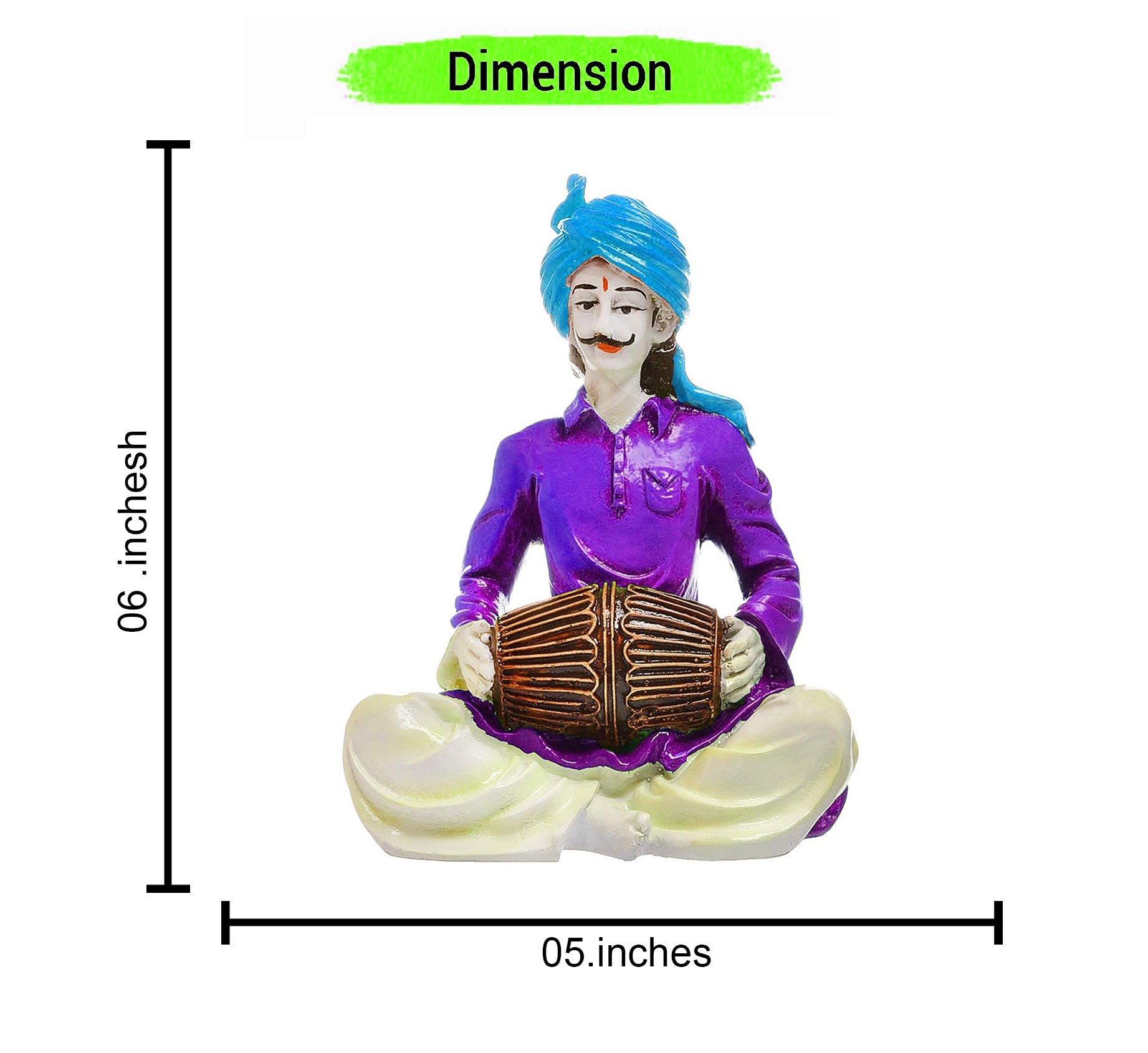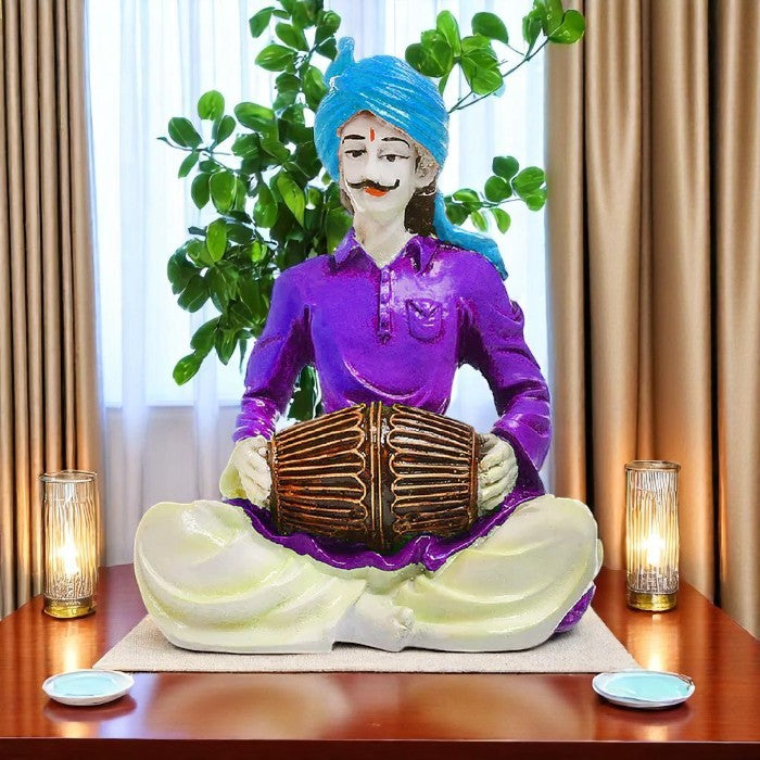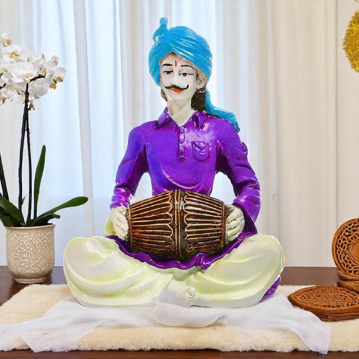 Opulent and delightful, this Rajasthani figurine is skillfully crafted from durable resin. Makes a charming present for loved ones, adding elegance to your hallway, bedroom or meditation corner. Showcase your style with this luxurious joyful beats. Vibrant male musician figure in a seated pose. Dressed in a purple shirt, cream dhoti, and blue turban. Playing a classic brown dholak. Placed on a fluffy light- mat over a dark wooden surface. Accompanied by an graceful white orchid plant. Soft, diffused lighting from background curtains. Represents cultural artistry and musical tradition. Suitable for display on shelves, mantels, or desks. Appealing to searches for rajasthani figurines, rajasthani gifts for girls and rajasthani statue showpiece, this Rajasthani figurine makes a charming showpiece or gift that celebrates cultural artistry.
