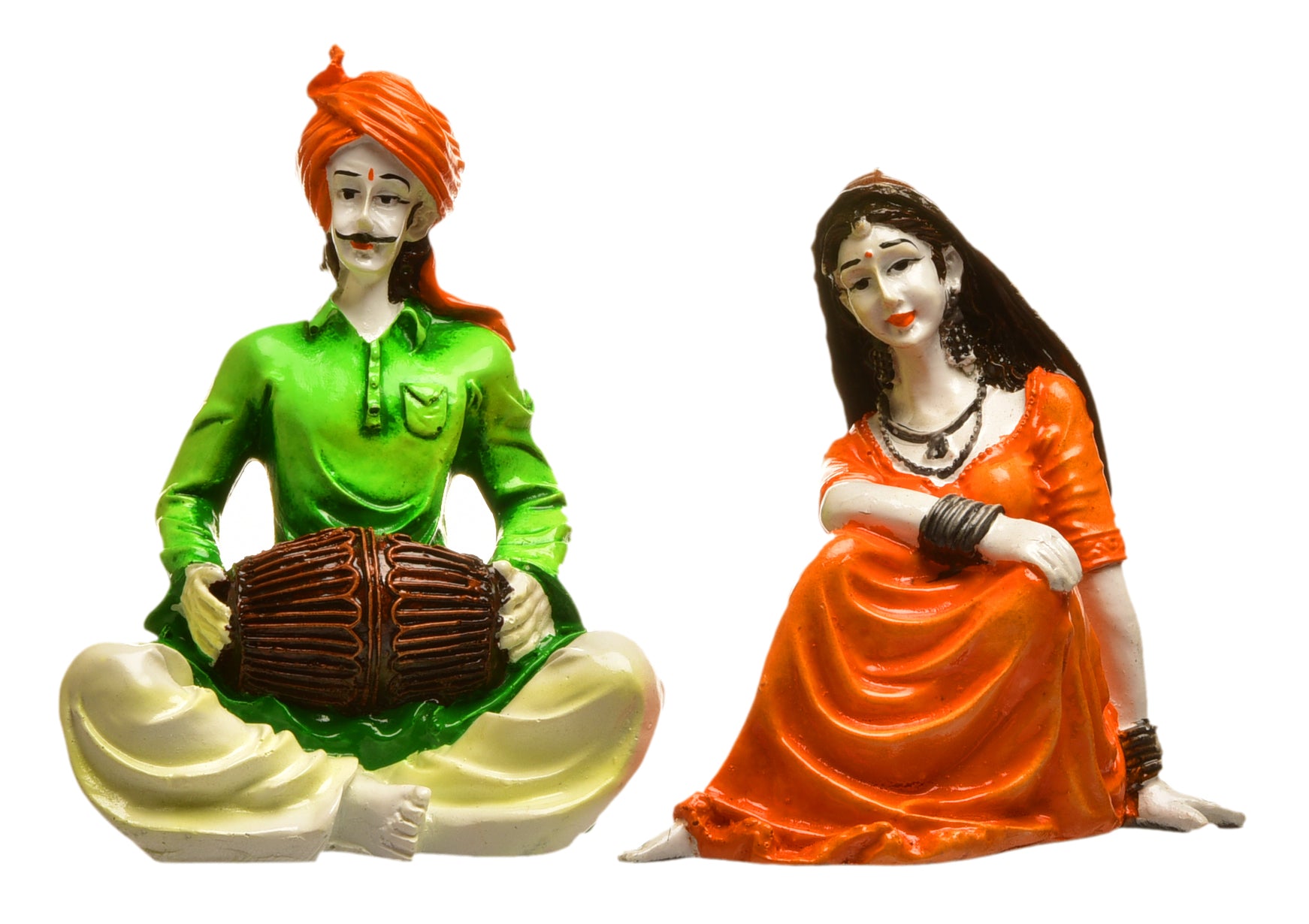Lavish, this Rajasthani figurine is expertly crafted from resin-crafted. A thoughtful gift for any occasion, accentuating your living room, office or prayer space. Showcase your style with this luxurious rajasthani musician. Depicts Classic Rajasthani Musicians: This charming resin set features a seated man playing a dhol (drum) and a seated woman, representing the folk music culture of Rajasthan. Vibrantly Hand- Each figure is meticulously hand- with bright and lively colors, bringing the cultural scene to life in your home. Authentic Rajasthani Attire: The couple is dressed in characteristic Rajasthani clothing and headwear, adding to the cultural authenticity of the piece. Perfect for Music and Culture Lovers: Thoughtful and Distinctive Gift: A distinctive and heartwarming gift for those who appreciate Indian folk art and music. Durable Resin Craftsmanship: Made from high- resin, ensuring lasting beauty and detailed detailing in the figures and the drum. Ready to Display: Simply place on any flat surface to instantly enhance your home' cultural ambianceBrings the Rhythms and Colors of Rajasthan: Introduce the rich artistic and musical heritage of Rajasthan into your living space. Suitable for display on shelves, mantels, or desks. Appealing to searches for rajasthani figurines, rajasthani gifts for girls and rajasthani statue showpiece, this Rajasthani figurine makes a charming showpiece or gift that celebrates cultural artistry.