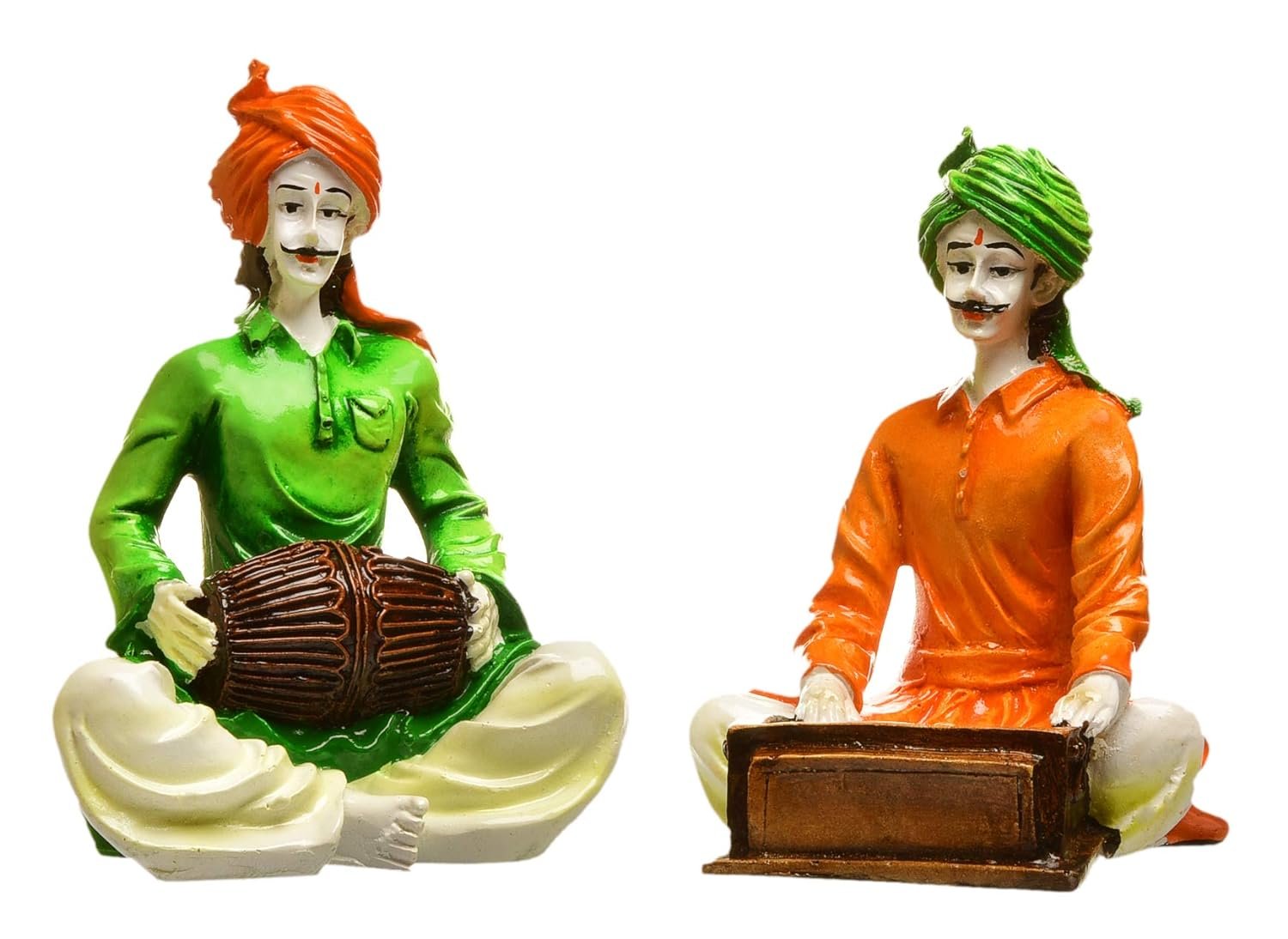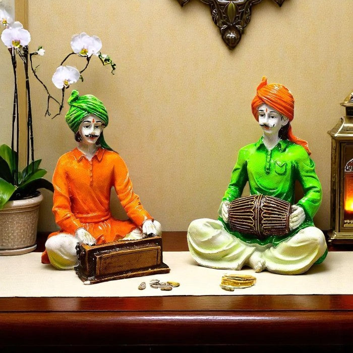 Opulent, this Rajasthani figurine is exquisitely crafted from premium materials. An ideal gift for housewarmings and festivals, suiting any living room, meditation area or office. Showcase your style with this luxurious traditions of. Musician Duo Set: Features two classic Rajasthani musicians. Harmonium and Mridangam: Showcases classic Indian musical instruments. Vibrant Attire: Adorned in colorful turbans and classic garments. Cultural Home Home Decor: Crafted By Hand Detail: Highlights detailed artistry and authenticity. Distinctive Gift Idea: Perfect for enthusiasts of Indian art, music, and culture. Suitable for display on shelves, mantels, or desks. Appealing to searches for rajasthani figurines, rajasthani gifts for girls and rajasthani statue showpiece, this Rajasthani figurine makes a charming showpiece or gift that celebrates cultural artistry.