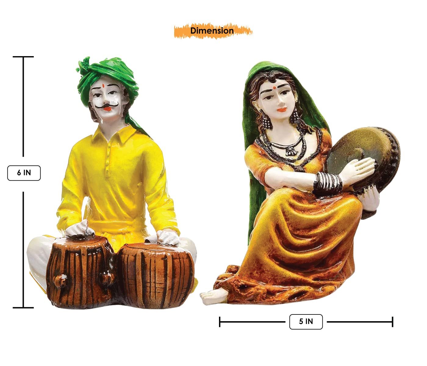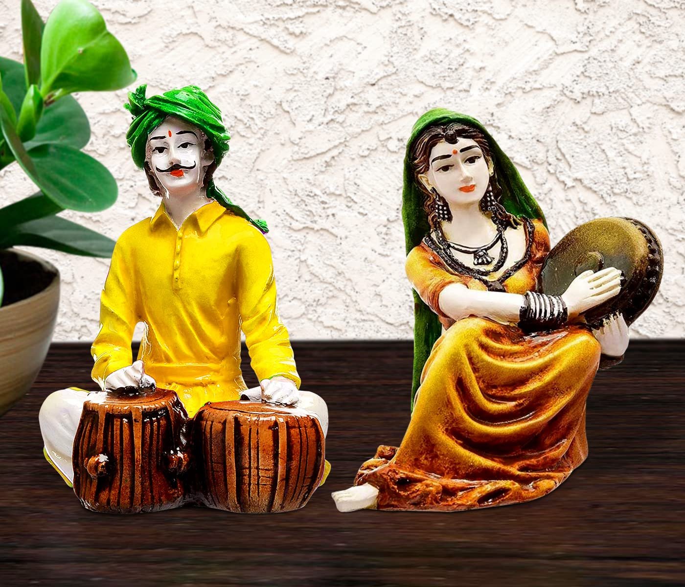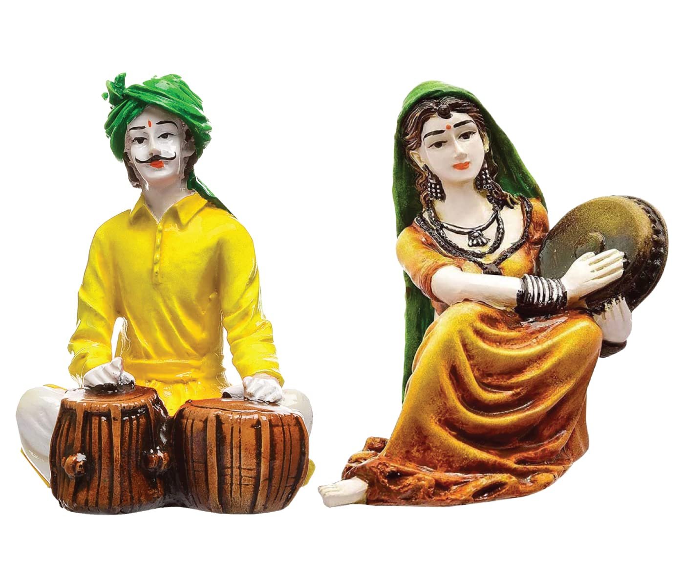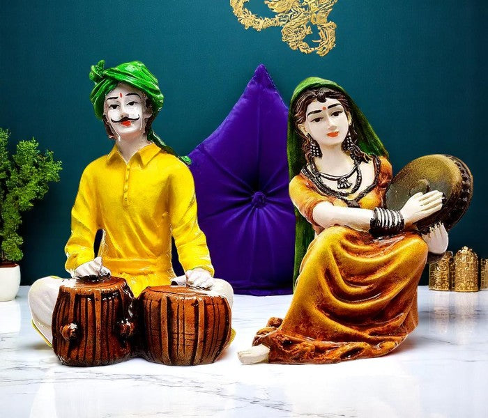 Exquisite, this Rajasthani figurine is meticulously crafted from resin-made. A wonderful housewarming or festival gift, decorating your dining room, entryway or home temple. Authentic Rajasthani Folk Art: This exquisitely sculpted resin set captures the essence of Rajasthan' rich cultural heritage, portraying a classic musician couple in vibrant, classic attire. Musical Duo: The male figure is depicted skillfully playing the Tabla, while the female figure elegantly holds a Dafli, symbolizing the joyous spirit and musical traditions of the region. Vibrant Hand- Details: Each figure boasts detailed hand- details with striking, festive colours, including a bright yellow kurta and green turban for the man, and an ochre- lehenga with green dupatta for the woman, bringing life and energy to your decor. Luxury Quality Resin Craftsmanship: Made from high- durable resin, these figurines are meticulously crafted with attention to classic facial features, detailed clothing, and musical instruments, ensuring lasting beauty. Culturally Rich Home Accent: Perfect for adding an exotic touch to your living room, entryway, study, or cultural display, inviting conversation and appreciation for Indian artistry. Thoughtful Cultural Gift: An ideal present for lovers of Indian culture, music enthusiasts, housewarmings, festivals like Diwali, or anyone who appreciates distinctive and meaningful decor. Stable and Eye- Display: Designed to stand independently, these statues make a captivating focal point whether placed together or separately, enhancing the visual appeal of any surface. Easy to Maintain: The smooth resin surface allows for effortless cleaning with a soft, dry cloth, preserving their vibrant colours and detailed details with minimal effort. Celebrates Indian Performing Arts: These figurines pay homage to the timeless tradition of Indian folk music and dance, embodying the cheerful and artistic spirit of Rajasthani people. Inspires Joy and Positivity: The lively depiction of the musicians with their expressive faces can uplift the mood of any room, filling it with a sense of celebration and cultural richness. Appealing to searches for rajasthani figurines, rajasthani gifts for girls and rajasthani statue showpiece, this Rajasthani figurine makes a charming showpiece or gift that celebrates cultural artistry.