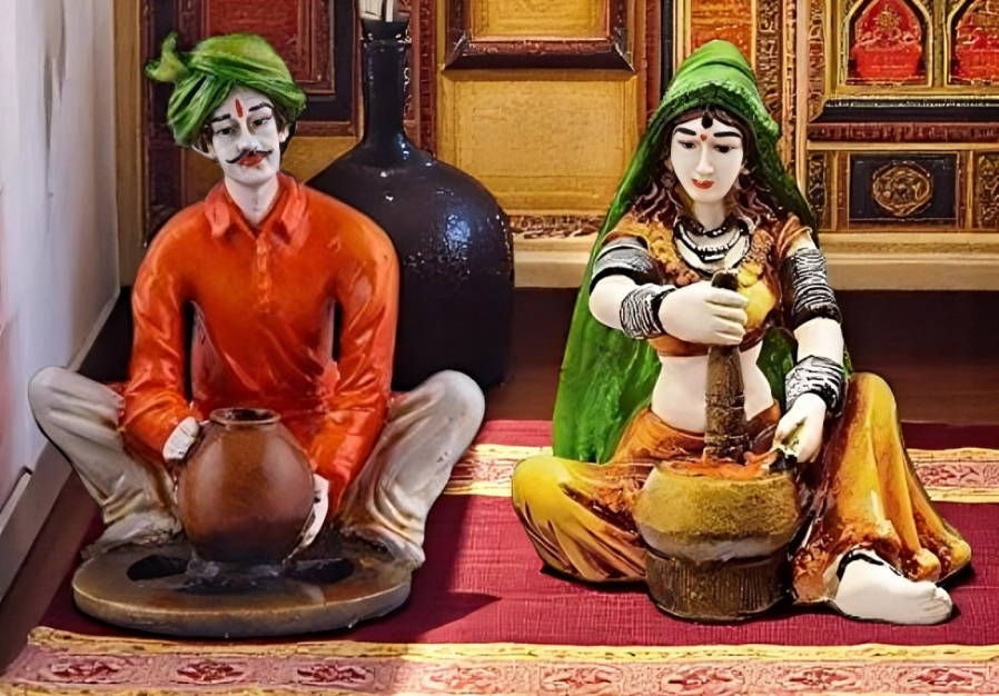 Everlasting and luxurious, this Rajasthani figurine is beautifully made from handcrafted resin. An excellent choice for spiritual and decorative gifting, gracefully decorating your table, shelf or altar. Charming Village Couple Theme Captures the essence of rural India with a man shaping clay pots and a woman grinding grains with a mortar and pestle. Vibrant Hand- Craftsmanship Finished with earthy tones, green turbans, and detailed classic attire for a vivid folk- look. Rustic Accent for Any Room Perfect for living room shelves, side tables, entrance foyers, or spiritual corners to create a warm, rooted ambiance. Distinctive Gift for All Occasions A meaningful and artistic present for housewarmings, Diwali, birthdays, or wedding gifts for lovers of Indian culture. Durable Resin Material Made with luxury resin for lasting strength and easy maintenance; colors stay fresh and striking over time. Crafted By Hand by Indian Artisans Celebrate classic craftsmanship while supporting local artistry in your contemporary or vintage dcor. Bring charm and elegance to your décor. Appealing to searches for rajasthani figurines, rajasthani gifts for girls and rajasthani statue showpiece, this Rajasthani figurine makes a charming showpiece or gift that celebrates cultural artistry.