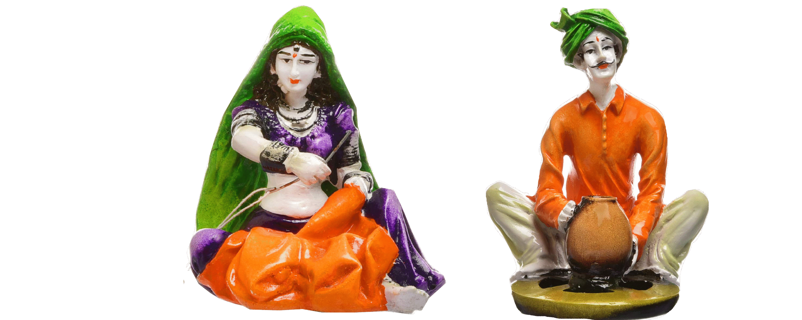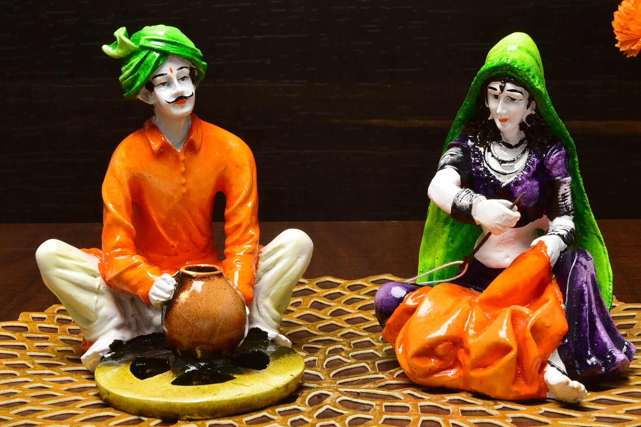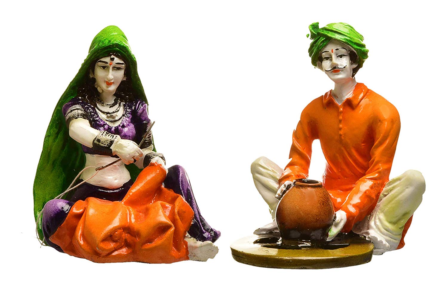 Unique and opulent, this Rajasthani figurine is beautifully made from premium materials. An excellent choice for spiritual and decorative gifting, gracefully decorating your table, shelf or altar. Depicts Classic Rajasthani Activities: This set showcases a seated woman weaving and a seated man tending to cooking over a small fire, illustrating everyday village life. Vibrantly Hand- Each figurine is carefully hand- with bright and authentic colors, highlighting their classic clothing and activities. Captures Rural Indian Culture: The attire, tools, and activities are representative of the rich cultural heritage of Rajasthan. One-Of-A-Kind Home Home Decor Accent: Perfect for adding a touch of cultural realism and rustic charm to your living space. Thoughtful Cultural Gift: A distinctive and heartwarming gift for those who appreciate Indian traditions and crafted by hand art. Represents the Fabric of Indian Village Life: Captures familiar and essential aspects of daily routines in rural India. Charming Artistic Collectible: A delightful addition to any collection of cultural figurines or folk art. Designed to complement modern and traditional interiors. Appealing to searches for rajasthani figurines, rajasthani gifts for girls and rajasthani statue showpiece, this Rajasthani figurine makes a charming showpiece or gift that celebrates cultural artistry.