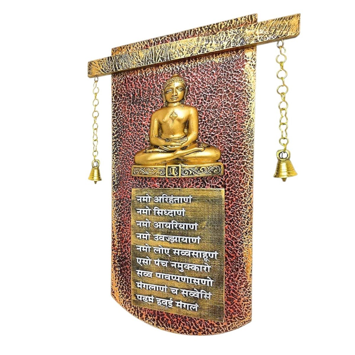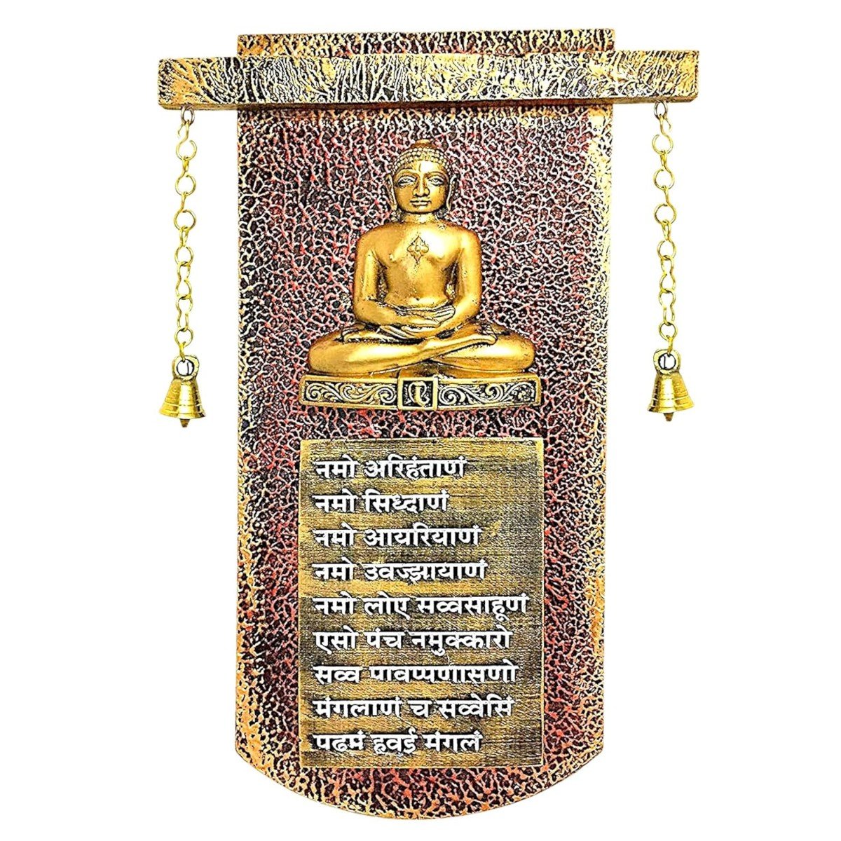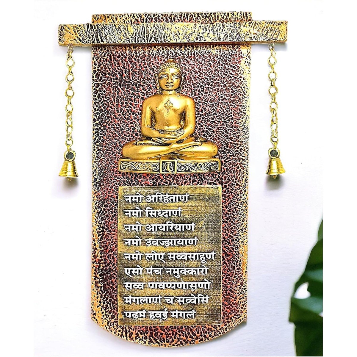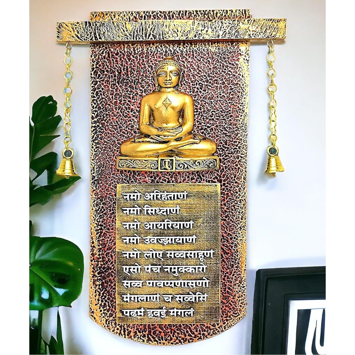 Chic and distinctive, this wall décor piece is meticulously crafted from resin-made. A wonderful housewarming or festival gift, decorating your dining room, entryway or home temple. Elevate your space with this mantra wall hanging, a spiritual home décor piece and meaningful gift for Diwali and housewarmings. Sacred Jain Wall Hanging with Bells: This exquisite resin-crafted wall hanging gracefully combines a depiction of a Jain Tirthankara, the powerful Navkar Mantra, and gentle hanging bells. Fortunate Home Blessing with Sound: Invite peace, positivity, and spiritual vibrations into your home with this meaningful Jain artwork enhanced by the soothing sound of the bells. Thoughtful Religious and Spiritual Gift: This one-of-a-kind wall hanging makes a considerate gift for Jain families, religious occasions, housewarmings, or anyone seeking spiritual inspiration and tranquility. Intricately Crafted Resin-Crafted with Bell Accents: Crafted from detailed resin-crafted with refined hanging bells, this wall hanging showcases a harmonious blend of artistic expression, spiritual significance, and gentle auditory charm. Versatile Spiritual and Sensory Accent: Perfect for hanging in living rooms, meditation spaces, entrances, or any area where you wish to create a serene, spiritually uplifting, and subtly melodious atmosphere. Features the Revered Navkar Mantra: The inclusion of the Navkar Mantra, the fundamental prayer in Jainism, underscores the auspiciousness and spiritual depth of this piece. Emblem of Peace, Enlightenment, and Harmony: The Tirthankara, the mantra, and the gentle sound of the bells together symbolize spiritual progress, peace, enlightenment, and inner harmony. Perfect for adding a stylish accent to your living space. Great for seekers of namokar mantra wall hanging, navkar mantra wall decor and navkar mantra frame design, this wall hanging infuses your home with spiritual and cultural depth.
