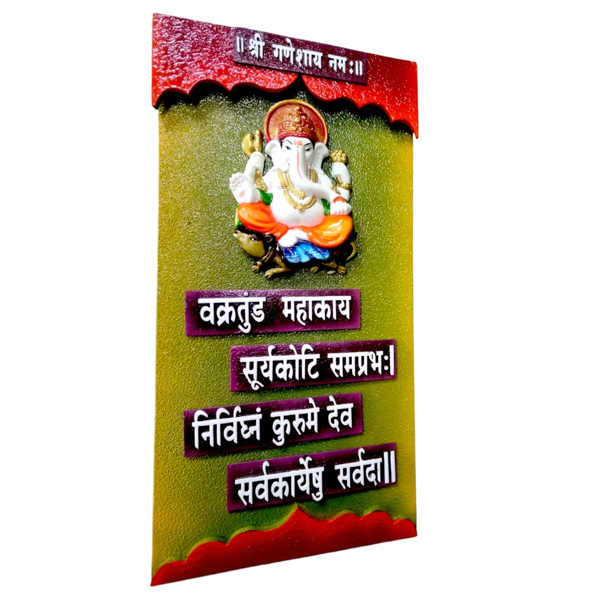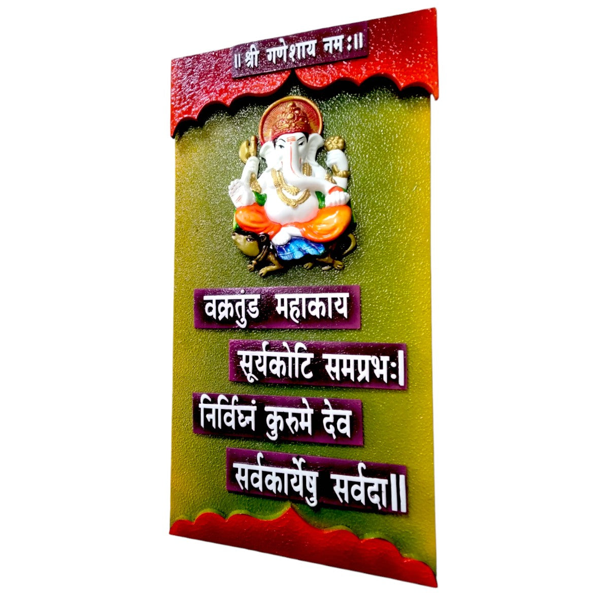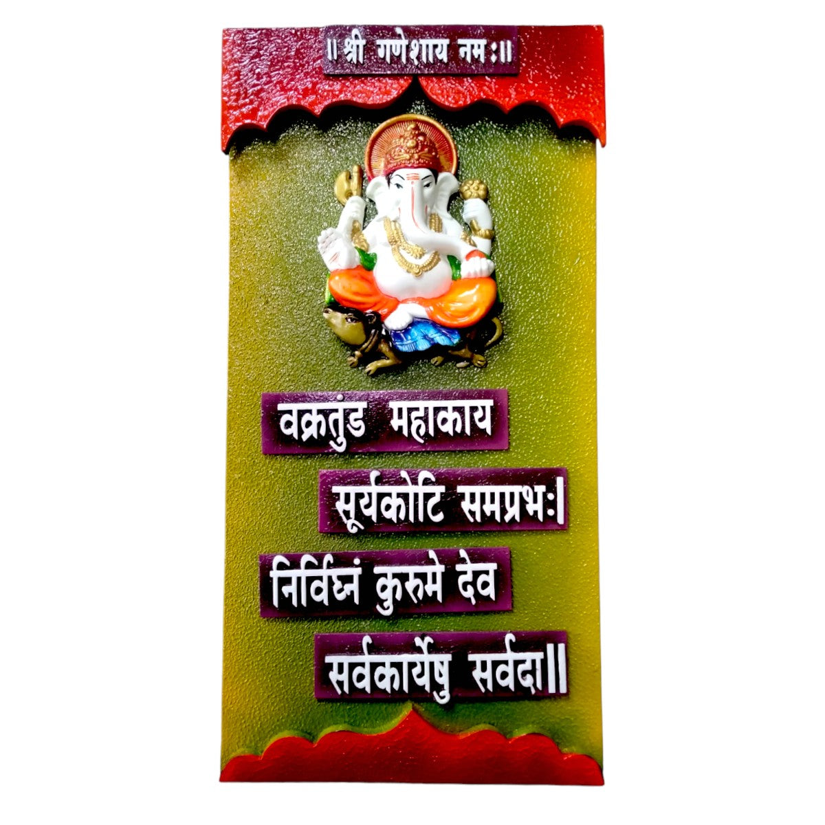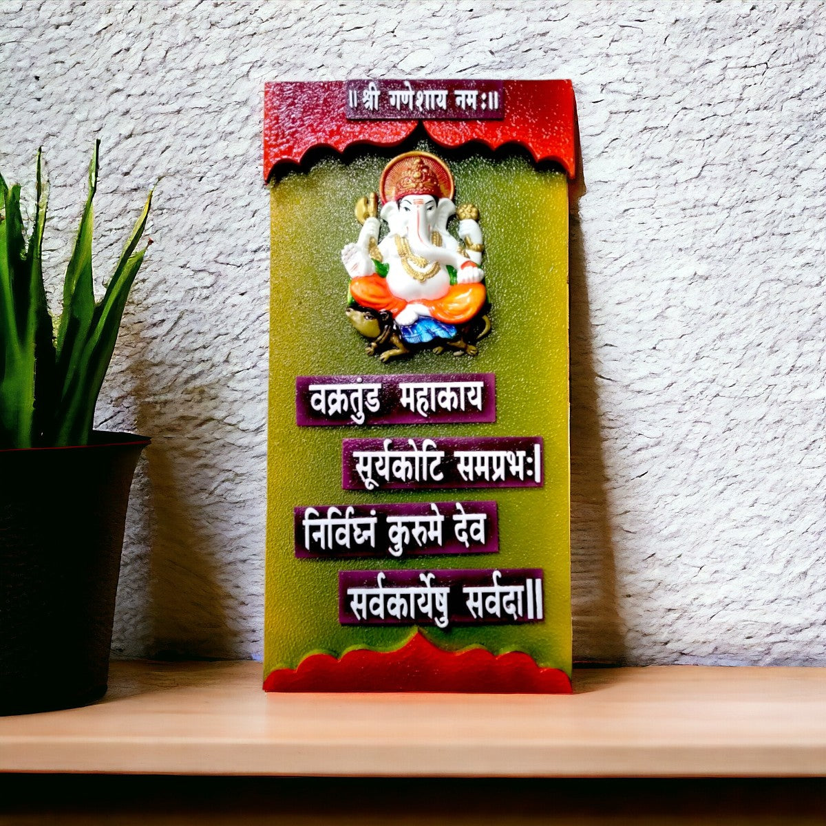 Fashionable and modern, this Ganesha idol is exquisitely crafted from premium resin. A lovely gift for holidays, birthdays or spiritual moments, complementing your living space, study or prayer area. Our beautiful Ganesh idol adds spiritual grace to your home décor and makes an ideal Diwali or housewarming gift. Aura of Divine Blessings: Features Lord Ganesha, the revered remover of obstacles and bestower of wisdom, bringing auspiciousness and positive vibrations into your space. Powerful Mantra for Success: Adorned with the "Vakratund Mahakay" mantra, invoking blessings for smooth beginnings, success in all endeavors, and the removal of hindrances. Vibrant and Layered Design: Crafted with a distinctive layered aesthetic, combining a rich red top and bottom with a luminous green main panel, creating a striking visual impact. Exquisite Ganesha Figurine: Showcases a gracefully detailed Ganesha figurine at the center, meticulously sculpted to radiate serenity and divine grace. Harmonious Home or Office Decor: Perfect for enhancing the spiritual ambiance of your study, living room, office desk, or puja area, inviting focus and positive energy. Thoughtful and Fortunate Gift: An ideal and meaningful present for housewarmings, new ventures, festivals like Ganesh Chaturthi, or for anyone seeking divine blessings and prosperity. Daily Source of Inspiration: This captivating piece serves as a constant reminder of Ganesha' power and the mantra' efficacy, inspiring peace, determination, and success in daily life. Perfect for adding a stylish accent to your living space. Perfect for devotees looking for orange colour ganesh murti, orange colour ganpati and ganesha with laptop, this Ganesh statue brings blessings and elegance to your space.