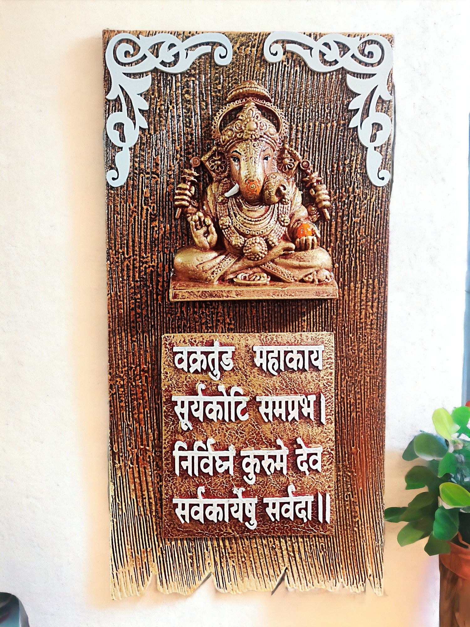 Graceful and luxurious, this Buddha statue is expertly crafted from resin-crafted. A meaningful gift for diwali or special occasions, enhancing your office desk, bookshelf or meditation area. Fortunate Presence of Ganesha: Features the revered Lord Ganesha, the harbinger of excellent fortune and remover of obstacles, bringing positive energy and blessings into your home. Powerful Mantra for Success: Adorned with the sacred "Vakratund Mahakay" mantra, invoking wisdom, prosperity, and the smooth completion of all endeavors. Rustic Wooden Charm: Crafted on a textured, wood- background with detailed patterns, offering a blend of classic devotion and earthy elegance for your home decor. Elegantly Detailed Artistry: Showcases a gracefully sculpted Ganesha figurine with fine details and a serene expression, complemented by delicate decorative accents at the top. Versatile Spiritual Home Decor: Perfect for adding a touch of divine grace to your puja room, living area, office, or entryway, creating a calming and inspiring ambiance. Meaningful Housewarming or Festival Gift: An ideal and thoughtful present for new beginnings, festive occasions like Ganesh Chaturthi, or for anyone seeking spiritual solace and prosperity. Inspiring Daily Reminder: Serves as a constant source of divine protection and motivation, filling your space with tranquility and a profound sense of spiritual well-. Makes an eye-catching addition to your office or home.