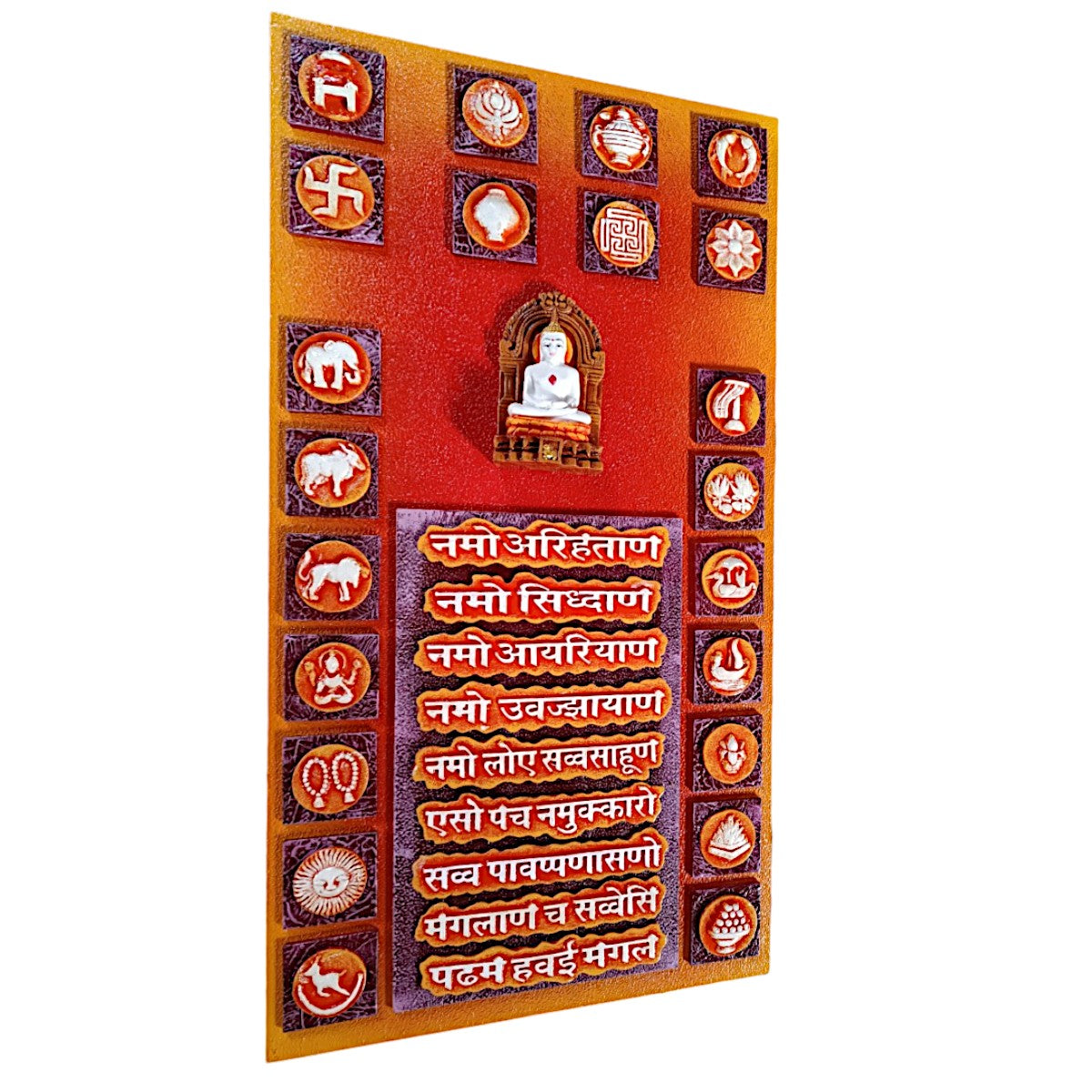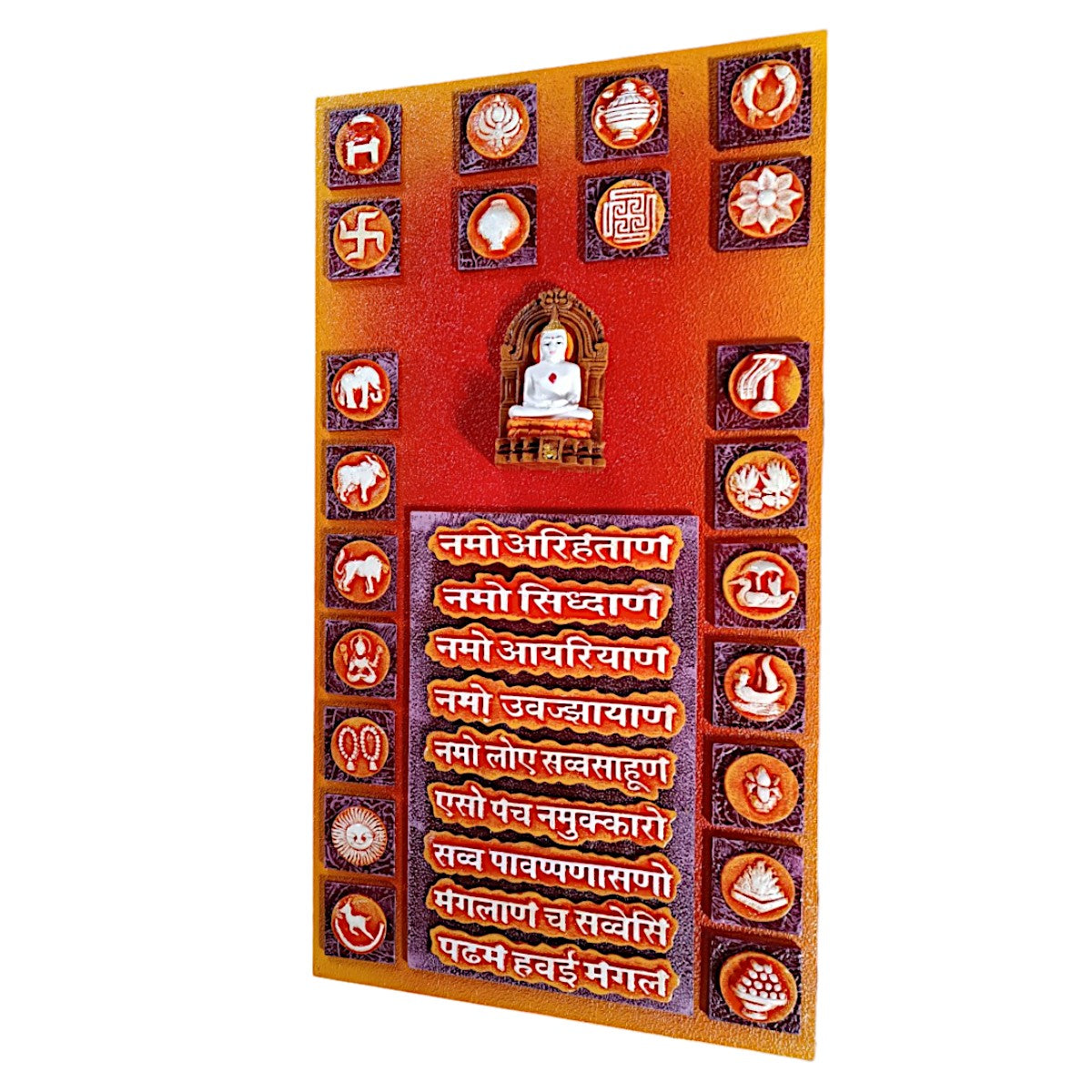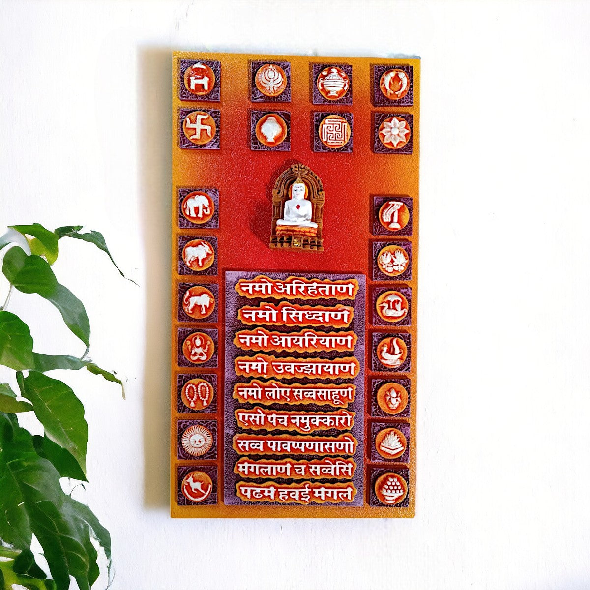 Fashionable and expressive, this wall décor piece is meticulously crafted from resin-made. Perfect for festive gifting and celebrations, bringing beauty to your home temple, office desk or study. Elevate your space with this mantra wall hanging, a spiritual home décor piece and meaningful gift for Diwali and housewarmings. Holistic Spiritual Essence: Features the complete Navkar Mantra alongside a serene Jain Tirthankara figure and 16 fortunate Jain symbols (Solah Sapan). It offers a comprehensive spiritual blessing for your space. Rich Tapestry of Jainism: Each of the 16 symbols, representing prosperity and virtue, is intricately detailed, creating a lovely visual narrative of Jain philosophy and tradition. Vibrant and Meticulous Craftsmanship: Crafted with rich, inviting colors and fine textures, every element is meticulously rendered, making it a true work of art that radiates devotion and durable. A Centerpiece of Serenity: Durable and Visually Captivating: Made with robust materials ensuring longevity, its vibrant hues and detailed iconography will remain a captivating and inspiring presence in your home for years. Profoundly Meaningful and Fortunate Gift: A truly exceptional present for Jain festivals (like Paryushan, Mahavir Jayanti), housewarmings, weddings, or for anyone seeking to embrace spiritual blessings and cultural heritage. Daily Path to Enlightenment: Serves as a constant, powerful reminder of the Navkar Mantra' profound wisdom and the virtues represented by the symbols, encouraging daily reflection and inner peace. An elegant addition to your home or workspace. Great for seekers of namokar mantra wall hanging, navkar mantra wall decor and navkar mantra frame design, this wall hanging infuses your home with spiritual and cultural depth.