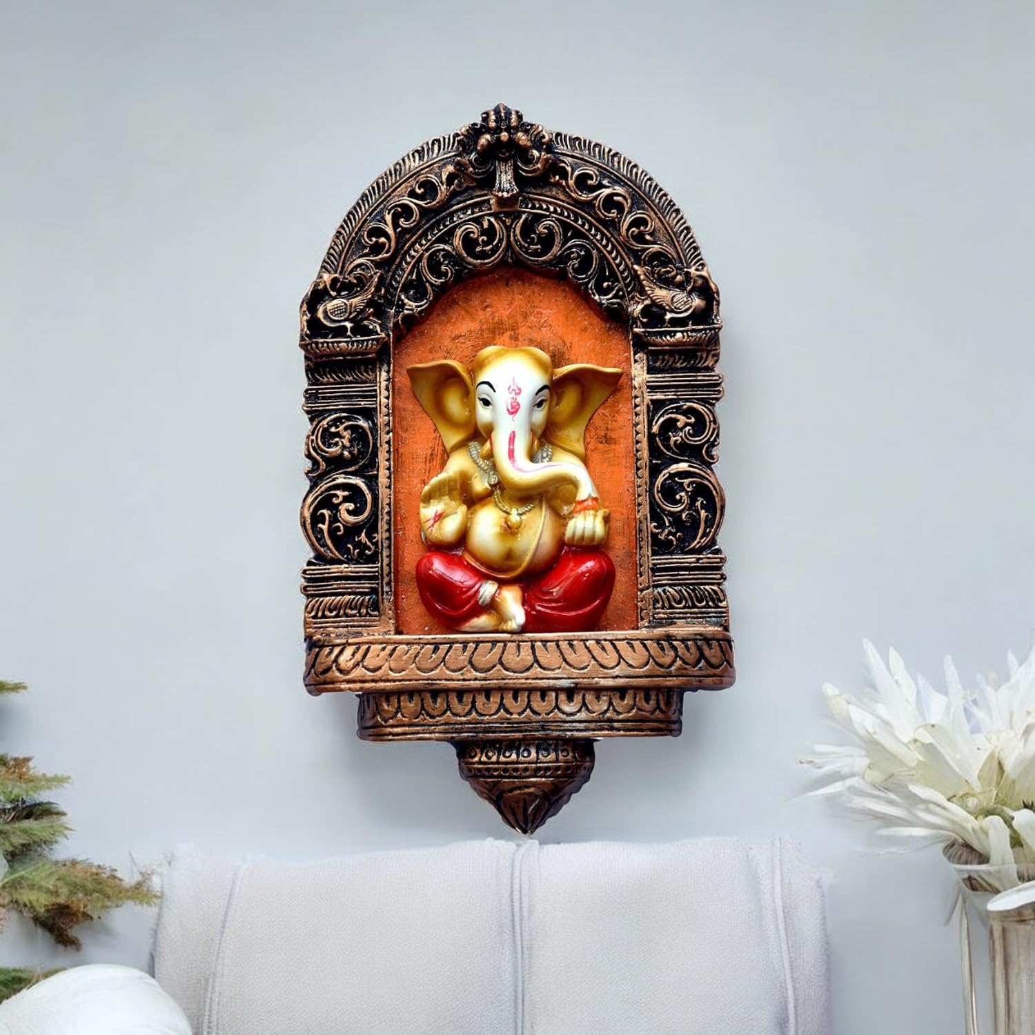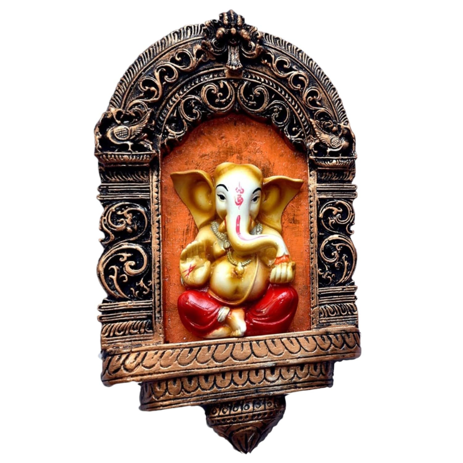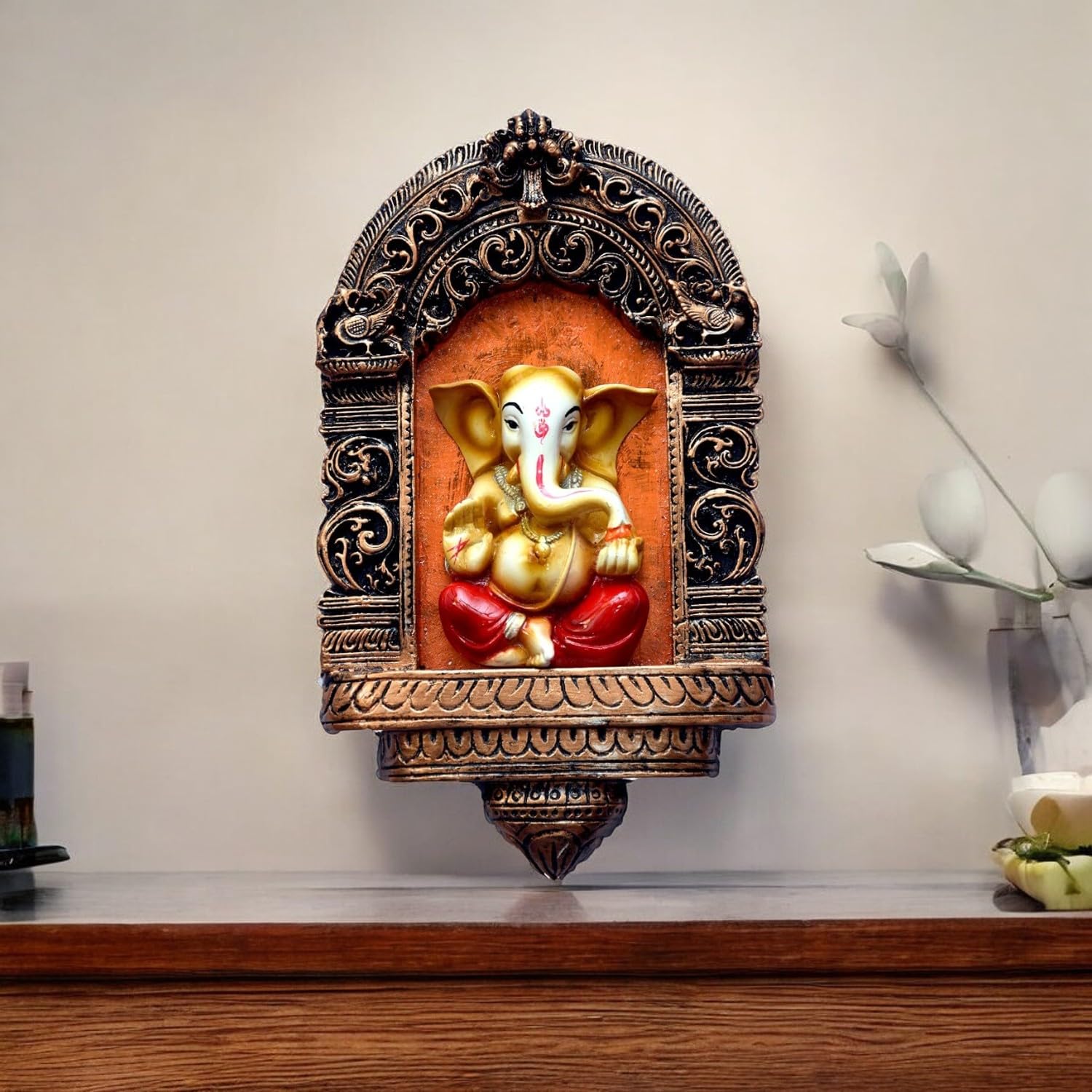 Timeless and sacred, this Ganesha idol is expertly crafted from resin-crafted. A meaningful gift for diwali or special occasions, enhancing your office desk, bookshelf or meditation area. Our beautiful Ganesh idol adds spiritual grace to your home décor and makes an ideal Diwali or housewarming gift. Divine Wall Art: A majestic Ganesha statue set within a detailed, classic archway frame, designed specifically to be hung on a wall, instantly becoming a focal point of devotion and beauty. Fortunate and Prosperity- The presence of Lord Ganesha is believed to usher in blessings of excellent fortune, wisdom, and prosperity, making this an ideal addition to any home or office. Luxury Resin with Ornate Finish: Meticulously sculpted from high- durable resin, the statue and its frame boast detailed carvings and a rich, multi- finish (golden Ganesha, antique bronze/ frame), giving it a luxurious and aged appearance. Classic and Graceful Design: The detailed framework and classic depiction of Ganesha add an authentic touch of Indian heritage, perfect for enhancing ethnic, classic, or even eclectic home decor styles. Versatile Placement: Meaningful Spiritual Gifting: A deeply cherished and fortunate gift for housewarmings, Diwali, Ganesh Chaturthi, weddings, inaugurations, or any occasion celebrating new beginnings and blessings. Bring charm and elegance to your décor. Perfect for devotees looking for orange colour ganesh murti, orange colour ganpati and ganesha with laptop, this Ganesh statue brings blessings and elegance to your space.