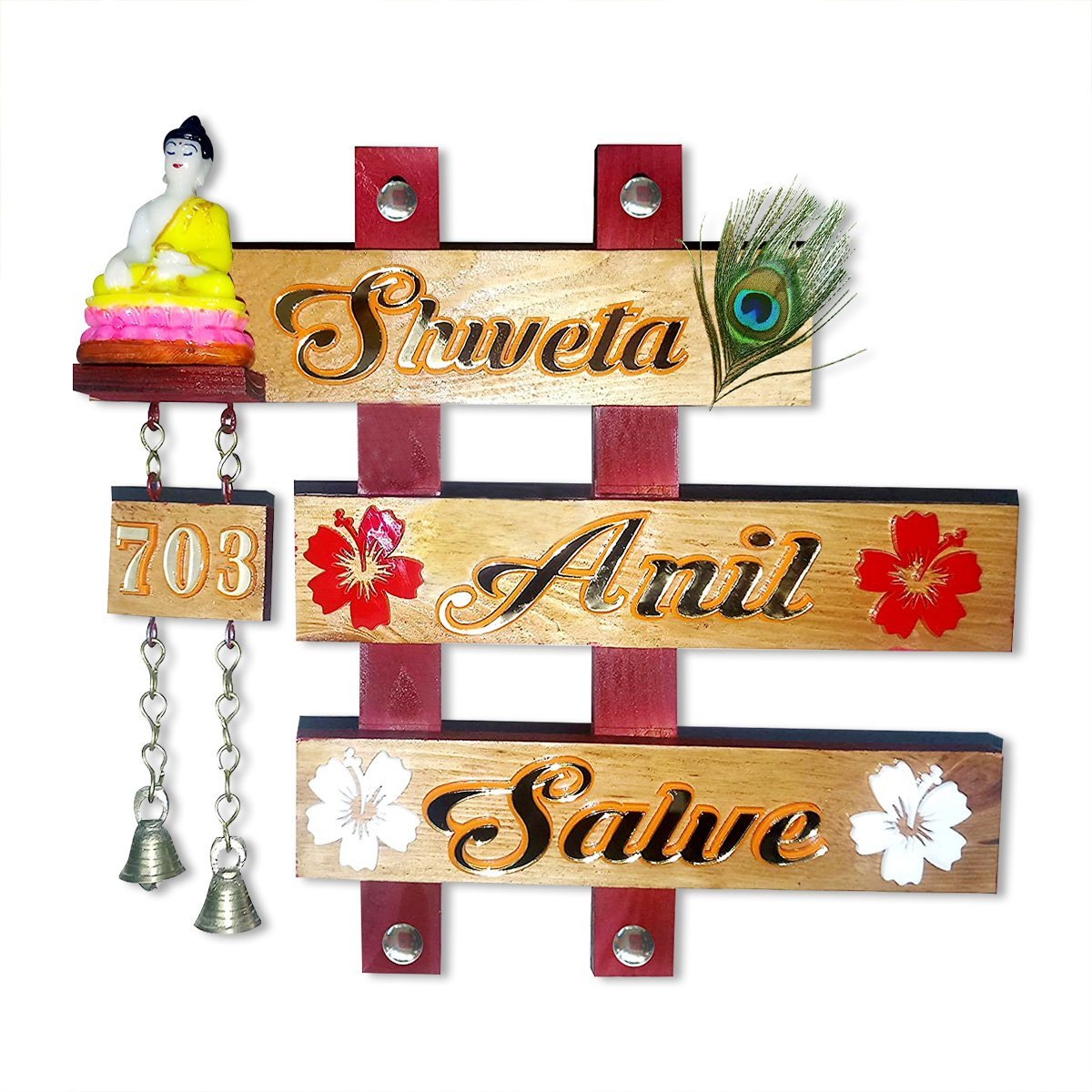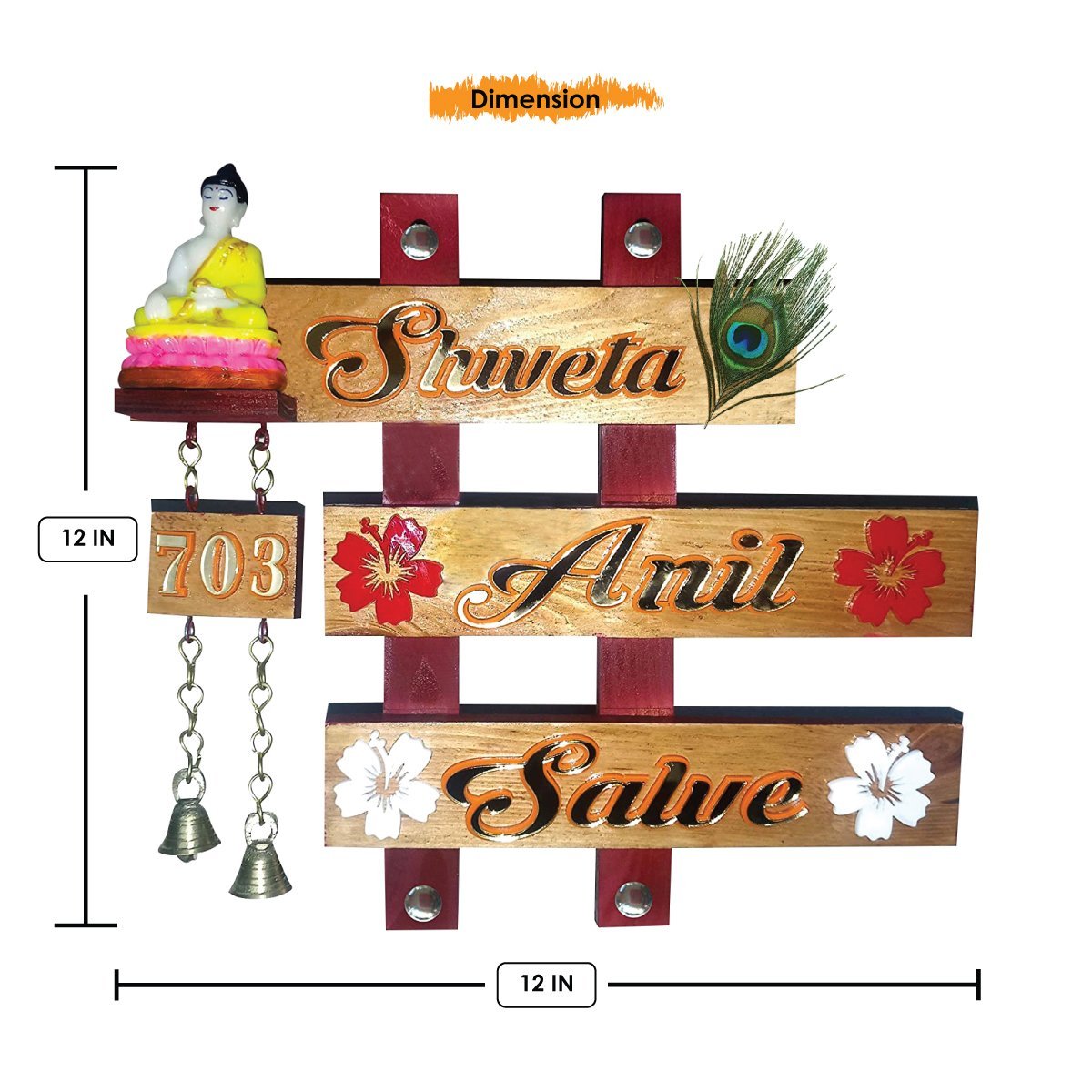 Premium, this custom name plate is meticulously crafted from handcrafted wood. A wonderful housewarming or festival gift, decorating your dining room, entryway or home temple. Personalize your entryway with this custom name plate, a stylish home décor accent and heartfelt housewarming gift. Enhance your living or working space with our exquisite wooden name plates, perfect for adding a personalized touch to apartments and offices or as a distinctive, thoughtful gift. These name plates are meticulously crafted from high- wood, ensuring exceptional durability and longevity. Our name plates are more than just identifiersthey are a statement of style and individuality. With our extensive customization options, you can create a name plate that perfectly reflects your personality and taste. Choose from a variety of designs, fonts, and engraving options to make your name plate truly one- Key Features: Durable and Long- Constructed from luxury wood, these name plates are designed to withstand the test of time, maintaining their elegance and integrity for years. Fully Customizable: Tailor your name plate to your liking with numerous design options, including different fonts, motifs, and personalized engravings. Versatile Applications: Sophisticated Aesthetic: Each name plate exudes a sense of refinement and style, making it a perfect addition to any dcor. Why Choose Our Wooden Name Plates? High- Craftsmanship: Our name plates are crafted with precision and care, ensuring each piece meets the highest standards of quality and beauty. Personal Touch: A customizable name plate adds a personal touch to your home or office, making it uniquely yours. Perfect Gift: Looking for a memorable and meaningful gift? A personalized wooden name plate is Sustainable Choice: Made from responsibly sourced wood, our name plates are an eco- option for conscientious consumers. Customization Options: Designs: From minimalist to ornate, choose a design that complements your style. Fonts: We have already chosen the best fonts for you and displayed them over the listing for better understanding. Engravings: Include names, titles, special dates, or even short messages to make it extra special. Transform your space with a wooden name plate that combines elegance, durability, and personal flair. Whether for your own use or as a cherished gift, our customizable name plates are a timeless addition to any environment. If you're seeking name plate design, house number plate and outdoor house number plate, this customized name plate enhances your home's entrance with a personal touch.