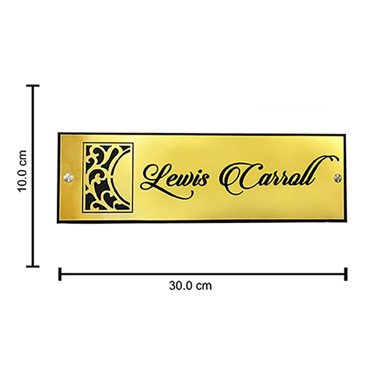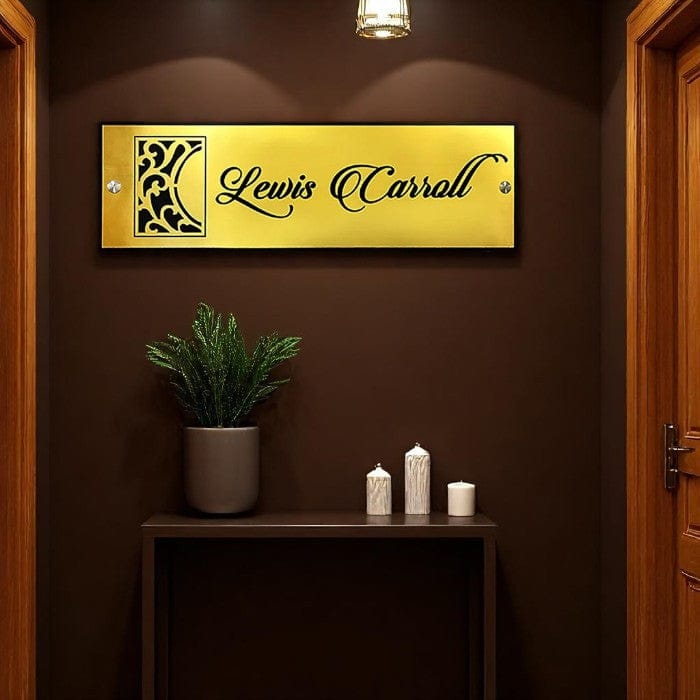 Everlasting and premium, this custom name plate is expertly crafted from metallic. A thoughtful gift for any occasion, accentuating your living room, office or prayer space. Personalize your entryway with this custom name plate, a stylish home décor accent and heartfelt housewarming gift. Luxurious Golden Finish: The polished golden background exudes a luxury and inviting aura, making a grand first impression. Graceful Cursive Typography: The name "Lewis Carroll" is exquisitely rendered in a sophisticated cursive font, adding a touch of classic charm. Detailed Design Element: A striking black ornamental pattern on the left side enhances the plate' visual appeal and adds an artistic flair. Durable Metal Construction: Crafted from high-, ensuring longevity and resistance to wear. Versatile Placement: Sleek Rectangular Design: Its clean, rectangular shape and perfect proportions make it suitable for various architectural styles. Easy Wall Mounting: Designed for straightforward installation, likely with visible or concealed screws for a secure fit. Thoughtful and Fashionable Gift: An excellent gift choice for housewarmings, office inaugurations, or for literary enthusiasts. Enhances Curb Appeal: Instantly upgrades the aesthetic of any entryway, reflecting refined taste and attention to detail. Bring charm and elegance to your décor. If you're seeking name plate design, house number plate and outdoor house number plate, this customized name plate enhances your home's entrance with a personal touch.