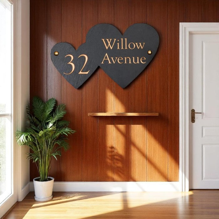 Everlasting and premium, this custom name plate is skillfully crafted from premium materials. Makes a charming present for loved ones, adding elegance to your hallway, bedroom or meditation corner. Personalize your entryway with this custom name plate, a stylish home décor accent and heartfelt housewarming gift. Personalized and Graceful Design: This "custom door sign for home" is uniquely designed in a double heart shape, allowing for personalized display of your house number and street name, such as "Willow Avenue". Luxury Craftsmanship: Made with a dark, slate- material and featuring striking gold- embossed lettering, this sign offers a sophisticated and welcoming touch to any entryway. Durable and Weather- Constructed to withstand outdoor elements, ensuring long- beauty and readability for years to come. Easy Installation: Designed for simple mounting on your door or wall, enhancing your home' exterior effortlessly. Enhanced Curb Appeal: A fashionable and functional addition that makes your home stand out, helping visitors and delivery services easily locate your address. Thoughtful Housewarming Gift: A distinctive and personalized gift for new homeowners, anniversaries, or special occasions, adding a distinctive touch to their residence. Versatile Placement: While Bring charm and elegance to your décor. If you're seeking name plate design, house number plate and outdoor house number plate, this customized name plate enhances your home's entrance with a personal touch.