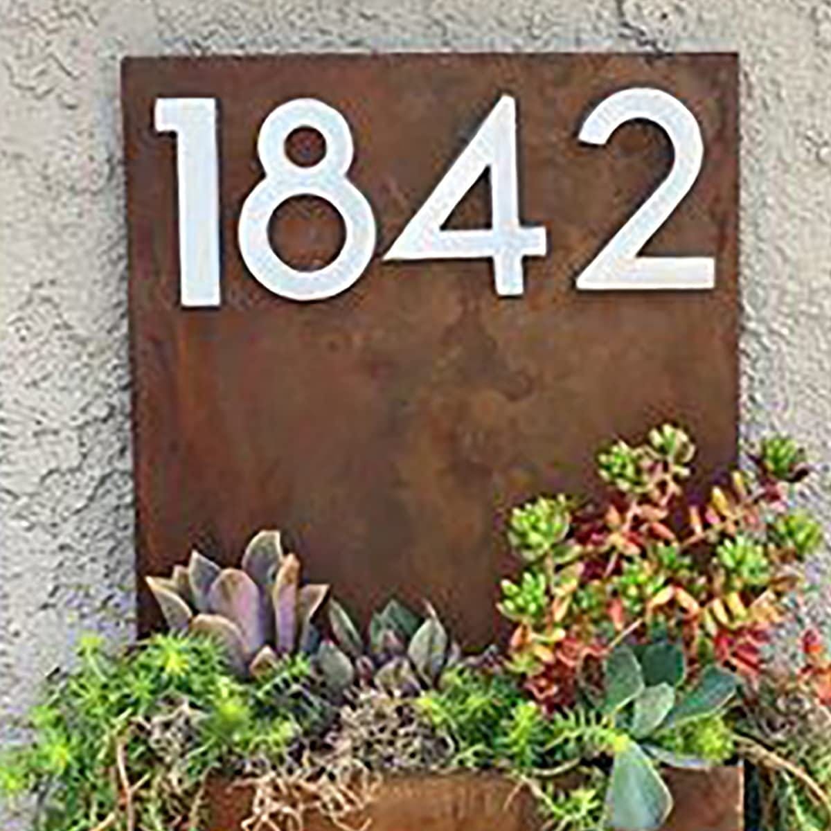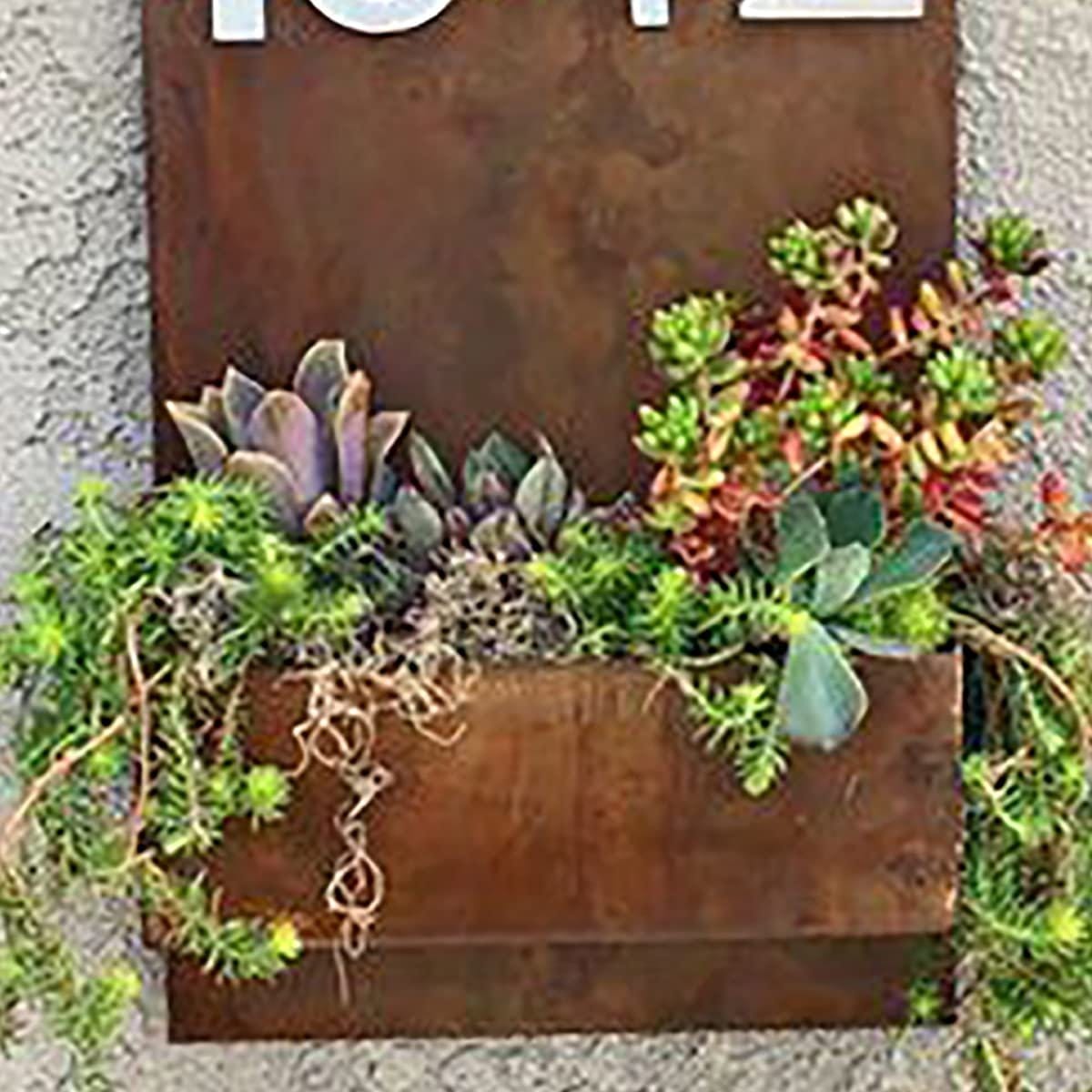 Opulent, this decorative accent is beautifully made from carved wooden. An excellent choice for spiritual and decorative gifting, gracefully decorating your table, shelf or altar. Personalize your entryway with this custom name plate, a stylish home décor accent and heartfelt housewarming gift. Showcase your style with this luxurious brown wood. . Distinctive Patina Finish: Features a rich, weathered, rust- or bronze- metal finish, offering an industrial or rustic appeal. Striking White Numbers: Displays large, crisp white house numbers (e. "1842") that contrast sharply with the dark background for high visibility. Integrated Succulent Planter: Includes a spacious planter box at the bottom, perfectly accommodating a vibrant variety of succulents and trailing plants like Sedum. Enhances Curb Appeal: Adds a distinctive and artistic statement to your home' exterior, blending industrial charm with natural elements. Lush Greenery Display: Durable and Weather- Constructed from sturdy metal, designed to withstand outdoor conditions and ensure long- beauty. Distinctive Housewarming Gift: A memorable and fashionable gift for homeowners who appreciate distinctive, rustic, or contemporary industrial design. Suitable for display on shelves, mantels, or desks. If you're seeking name plate design, house number plate and outdoor house number plate, this customized name plate enhances your home's entrance with a personal touch.