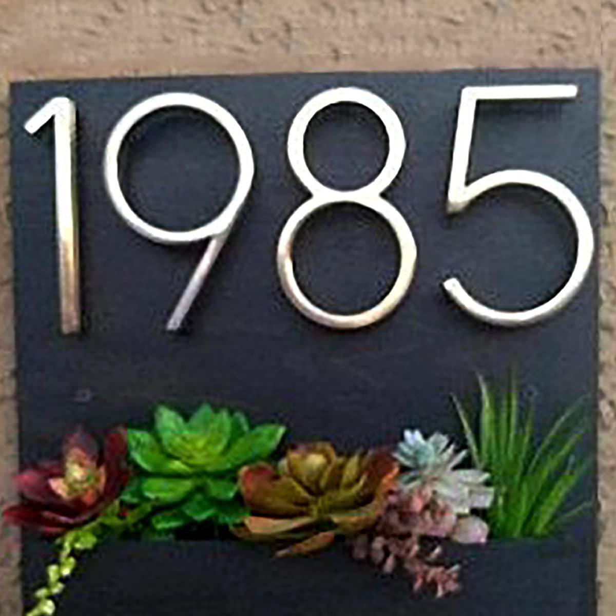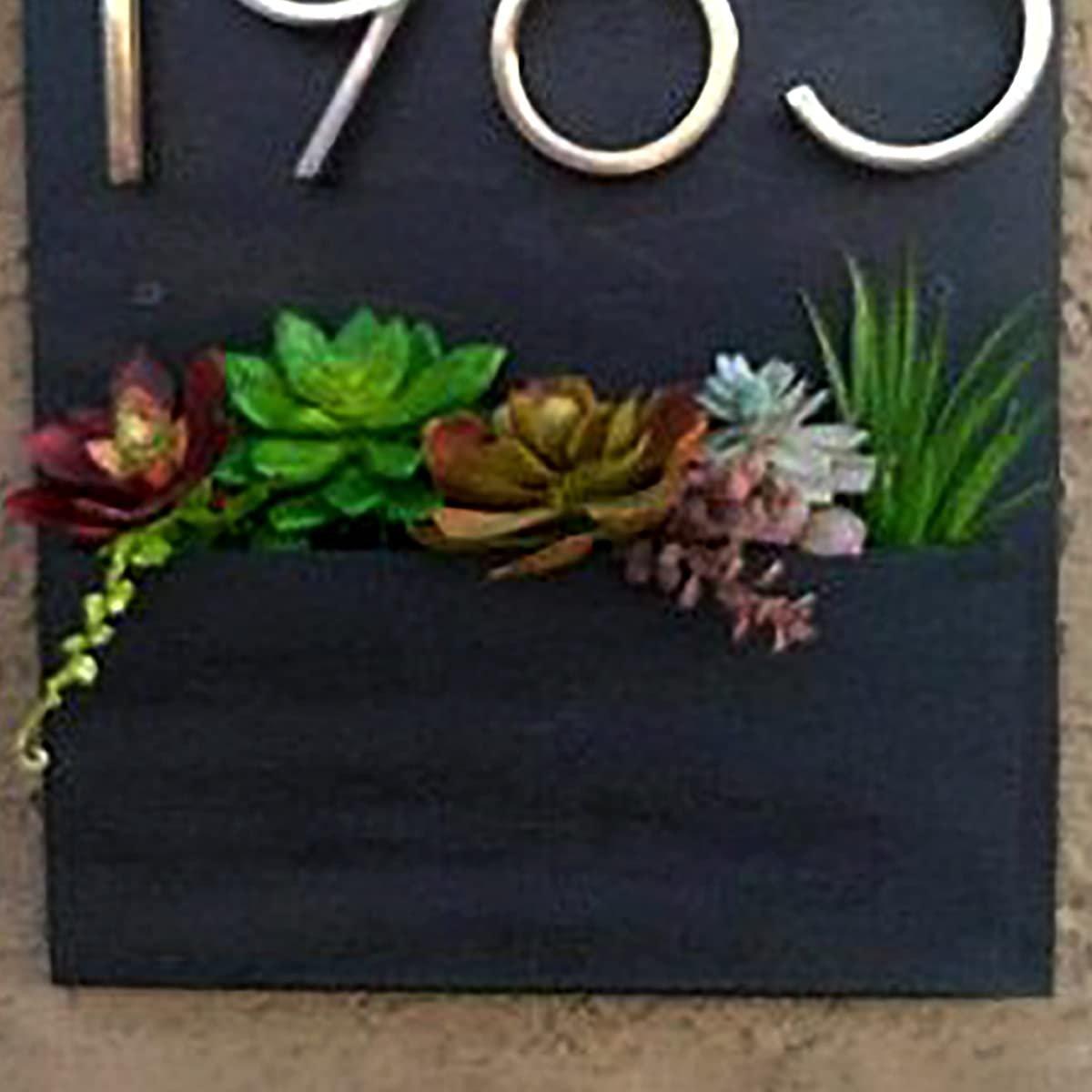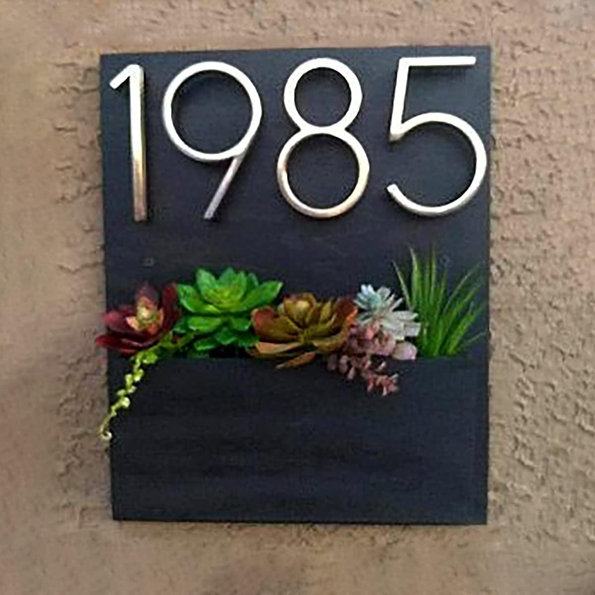 Luxurious and high-quality, this decorative accent is expertly crafted from wooden. A thoughtful gift for any occasion, accentuating your living room, office or prayer space. Personalize your entryway with this custom name plate, a stylish home décor accent and heartfelt housewarming gift. Showcase your style with this luxurious wood planter. Sleek Black Design: Features a minimalist black rectangular plaque that provides a sophisticated and contemporary backdrop. Graceful Gold Numbers: Displays prominent gold or brass- house numbers (e. "1985") for a luxurious contrast and excellent visibility. Integrated Succulent Planter: Includes a built- planter box below the numbers, ideally sized for a diverse and colorful arrangement of succulents or small plants. Enhances Curb Appeal: Elevates your home' exterior with a personalized and inviting statement, blending contemporary aesthetics with natural beauty. Vibrant and Low- Perfect for succulents, offering a stunning and diverse plant display that requires minimal watering and care. Durable and Weather- Constructed from robust materials (likely metal or durable composite) designed to withstand outdoor conditions, ensuring longevity. Fashionable Housewarming Gift: An excellent and distinctive gift for new homeowners or those looking to add a touch of contemporary elegance and greenery to their entryway. Suitable for display on shelves, mantels, or desks. If you're seeking name plate design, house number plate and outdoor house number plate, this customized name plate enhances your home's entrance with a personal touch.